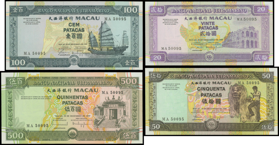 Macau, Banco Nacional Ultramarino, short set of 4 notes from the 1999 issue, $20, $50, $100 and $500 all with the same MA50095 prefix,