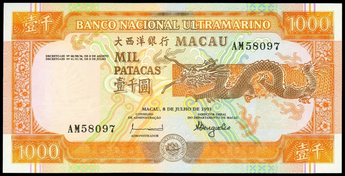 Banco Nacional Ultramarino, 1000 patacas, 1991, serial number AM 58097, orange on multicolour underprint, dragon at right, ship seal at bottom centre, reverse orange and pale green,