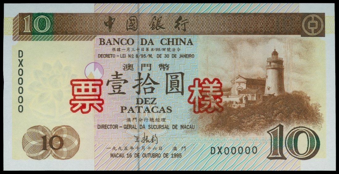 Banco da China, 10 patacas, specimen, 1995, serial number DX00000 brown on multicolour underprint, light house at right, two red Chinese characters 'Specimen' overprinted at centre, reverse brown and multicolour, bank building at left,