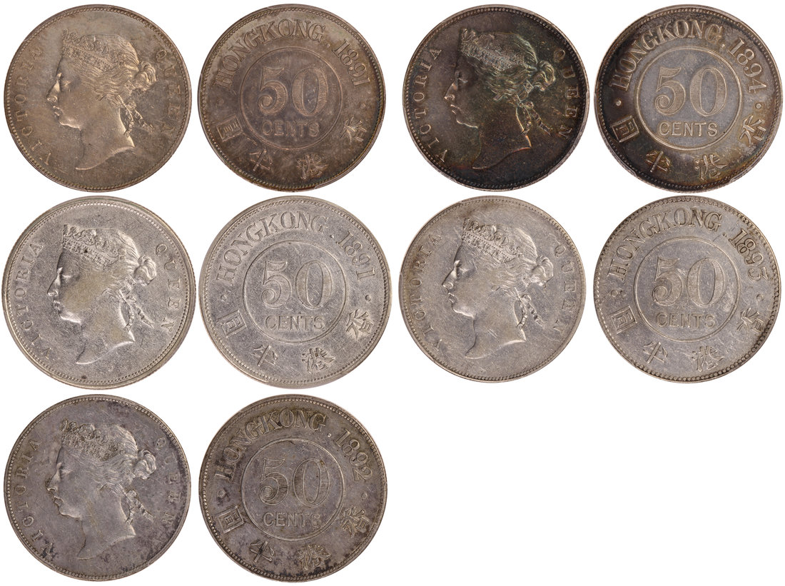 Hong Kong, group of 5x silver 50 cents, 1891, 1891-H, 1892, 1893 (small ring) and 1894,