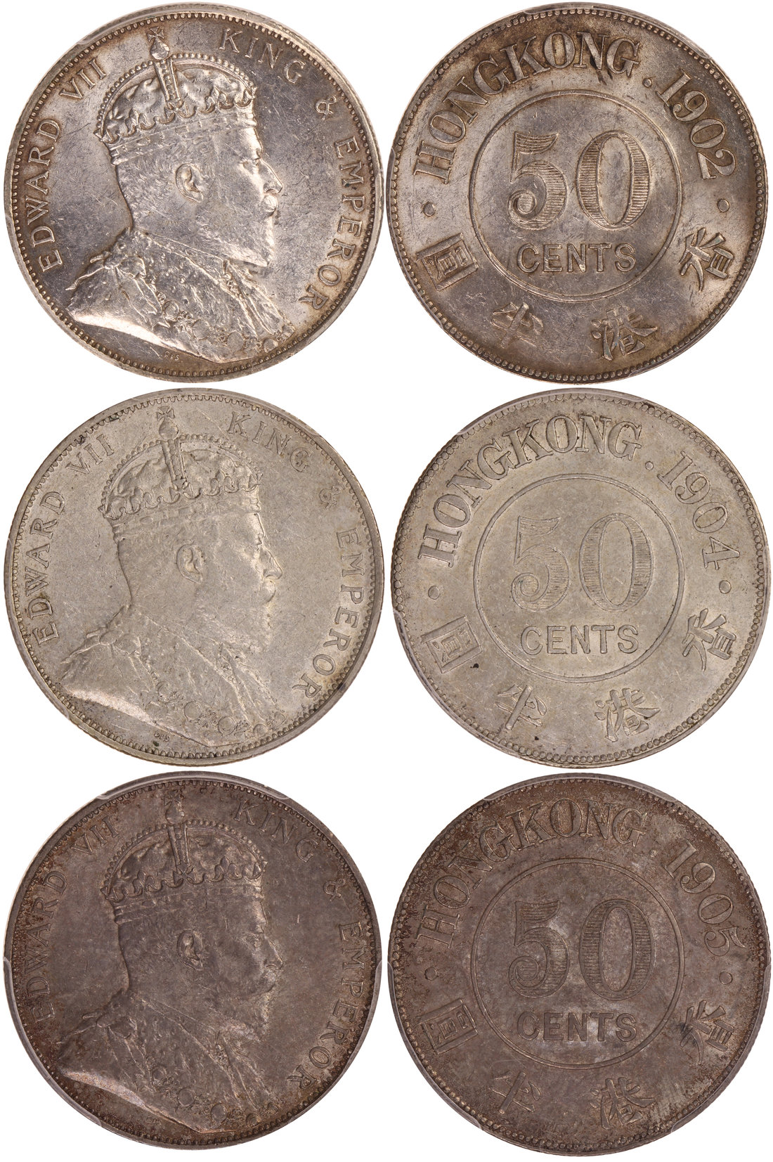 Hong Kong, group of 3x silver 50 cents, 1902, 1904 and 1905,
