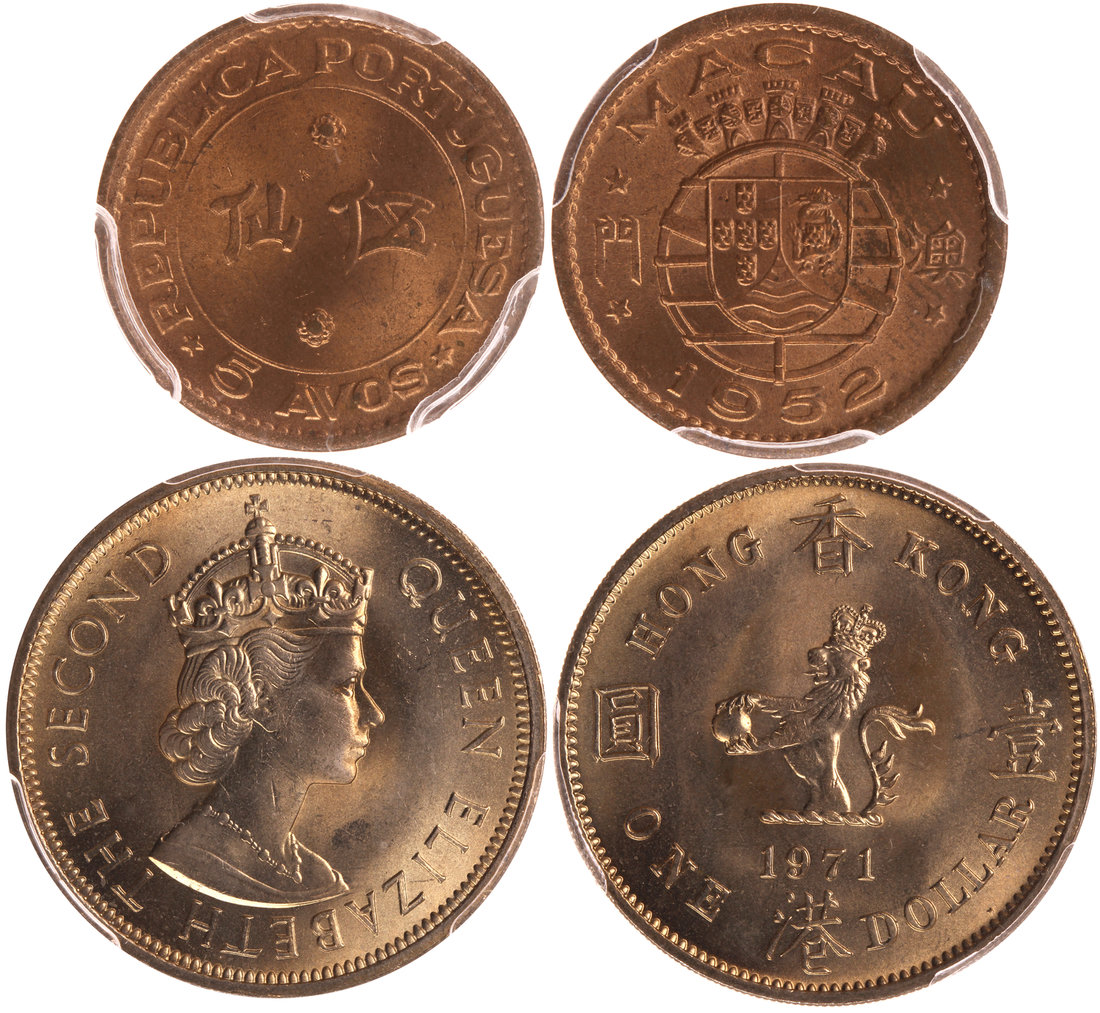 Hong Kong and Macau, group of 2 modern coins, 5 avos, 1952 and $1, 1971-H,