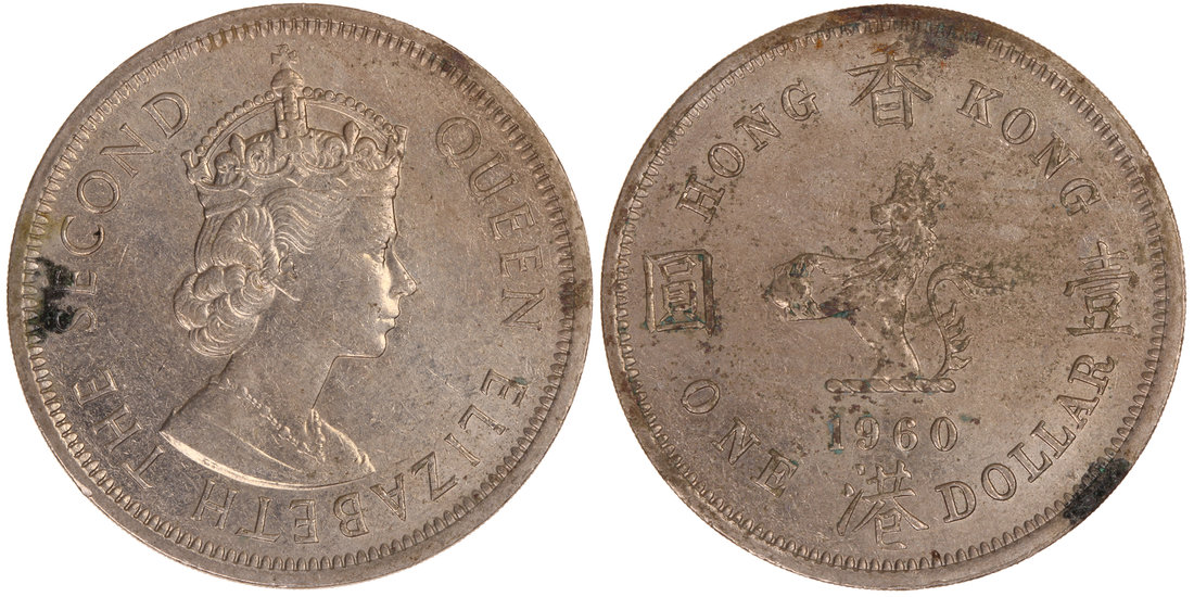 Hong Kong, $1, 1960, 'Mint Error', the obverse rotated by about 30 degrees,
