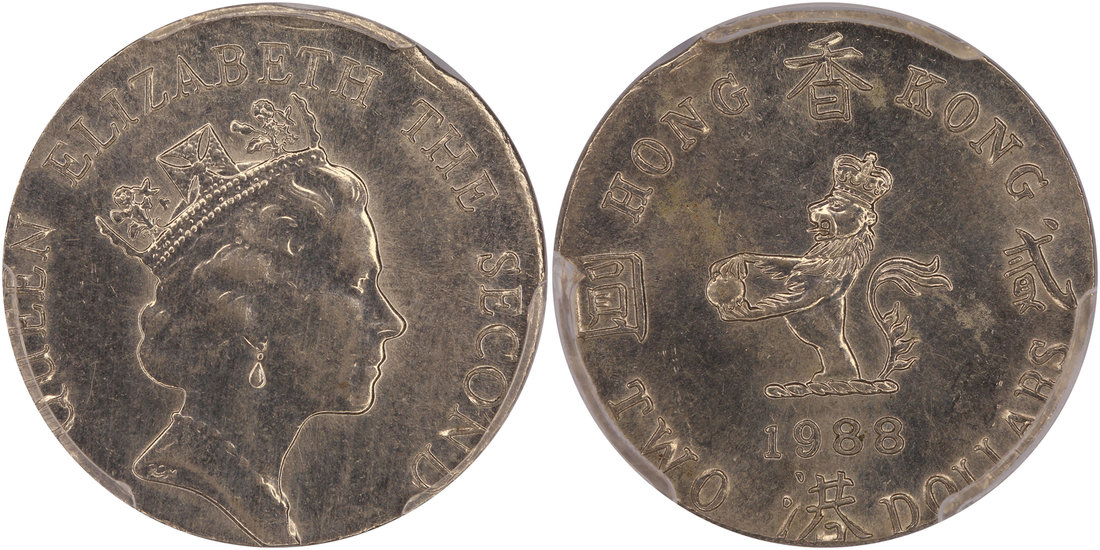 Hong Kong, a 'Mint Error' $2, 1988, struck on an incorrect planchet, weighs 5.1 grams,