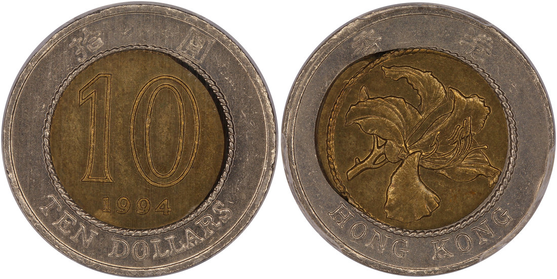 Hong Kong, a 'Mint Error' $10, 1994, mis-fed centre plug on reverse,