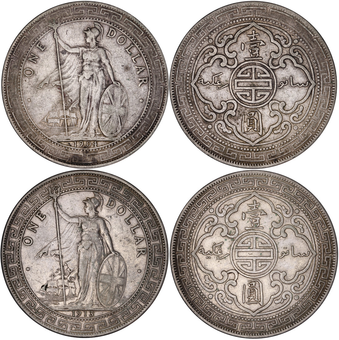 Great Britain, a lot 2x silver trade dollars, 1904 and 1913-B, Britannia holding a trident and shield on obverse,