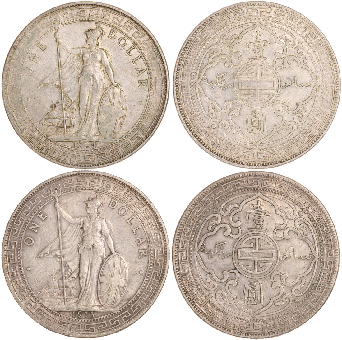 Great Britain, lot of 2x silver Trade Dollars, 1904-B and 1913-B, Britannia holding a trident and shield on the obverse,