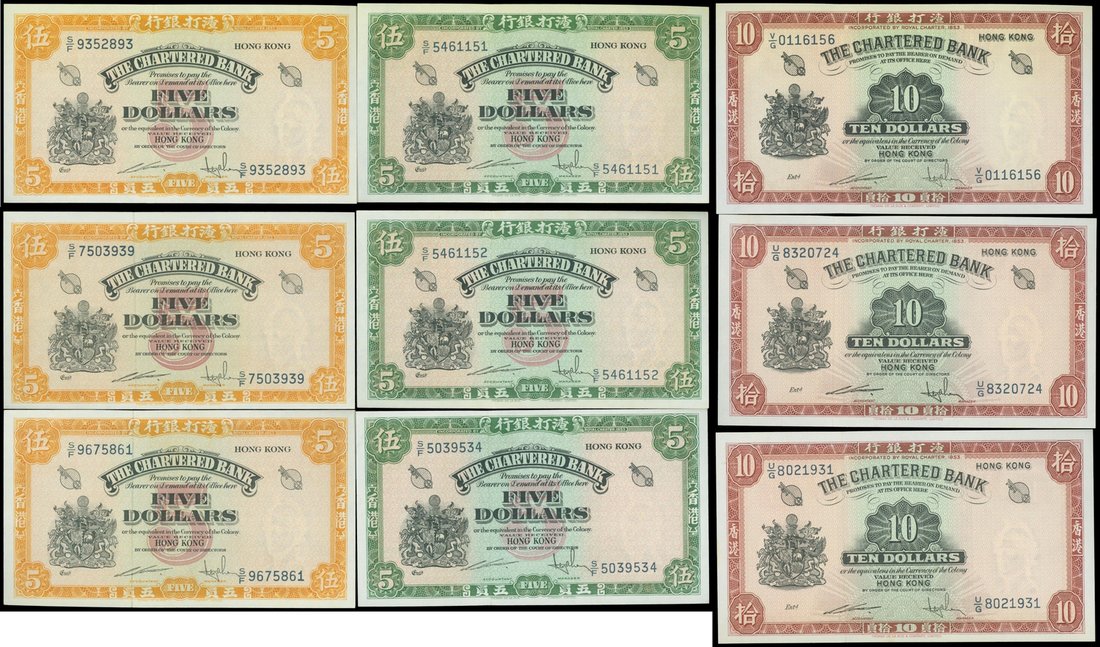 The Chartered Bank, group of 9 notes containing, $5, 'green key', $5 'yellow key' and $10 'red key', 3 notes of each type,