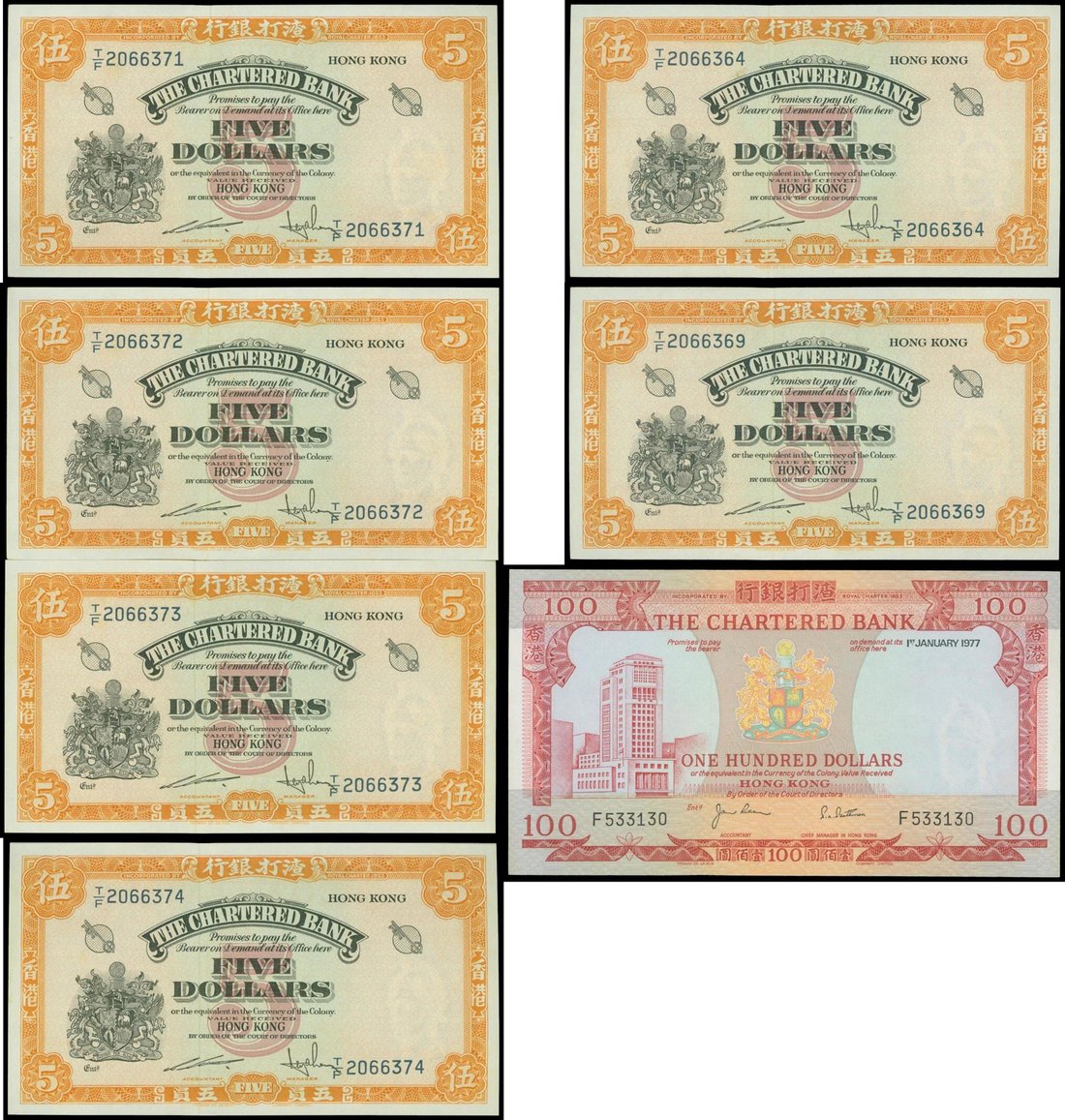 The Chartered Bank, a group of 7 notes, $5, 'yellow key' in near conscutive numbers, (6), and $100, 'Red House', 1977, serial number F533130,