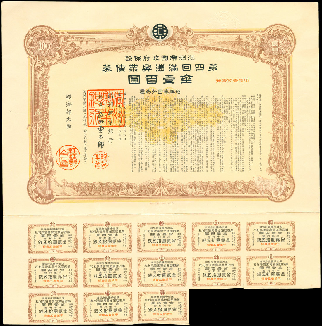 The 4th Manchukuo Industrial Loan, bond for 100 gold yen, 1940, number A151, brown and yellow, ornate border, red chops, with coupons,