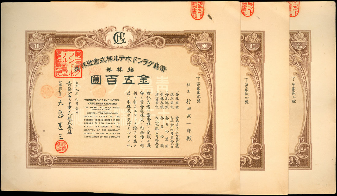 Tsingtao Grand Hotel, 3 consecutive 500 yen shares certificates, 1920, number 223-5, brown ornate border, text in English and Japanese, red seals,