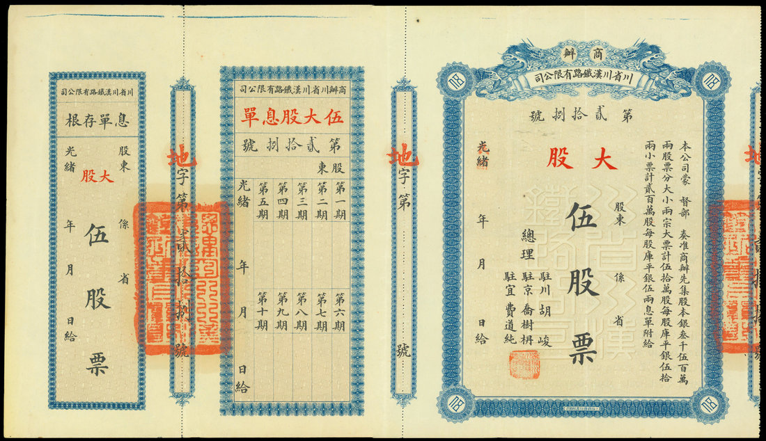 Sezchuan-Hankow Railway Co., Ltd., certificate of 5 shares, unissued, number 28, red 'Republic' seal stamped on 'Guangxu', blue ornate border, Chinese company name at top centre, dragons left and right,