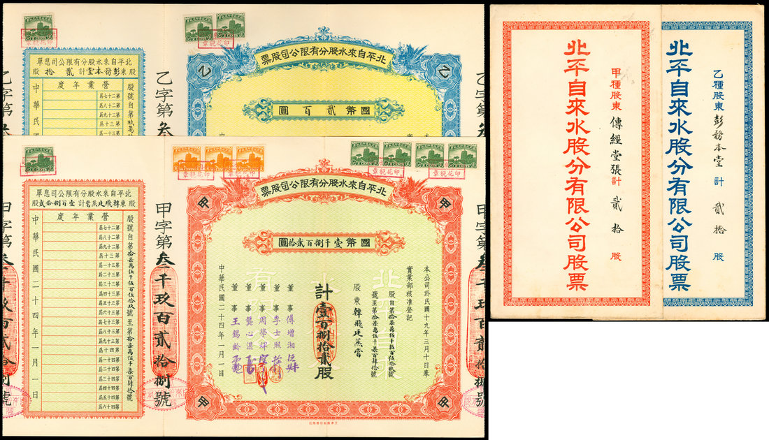 Peking Water Supply Company Limited, a pair of shares certificates, series A and series B, one for 1820 yuan of 182 shares, other for 200 yuan of 20 shares, 1935, number A3928 and B3069 respectively, red ornate border, light green underprint and blue ornate border, yellow underprint, both adhesived with revenue stamps at top and attached with counterfoils,