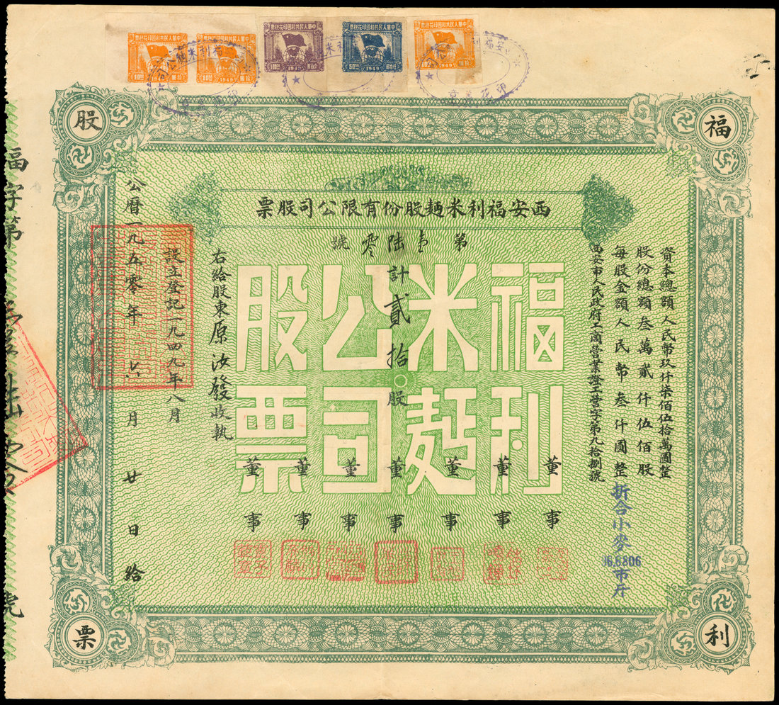 Xian Fu Li Flour and Rice Company Ltd., a certificate of 20 shares for 3000 yuan renminbi, 1950, number 160, green, floral ornate border, red chops, revenue stamps adhesived at top border,