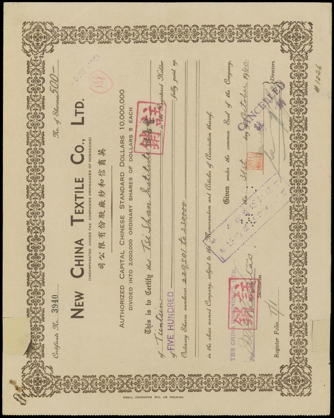 New China Textile Co., Ltd., certificate for 500 shares of $5, 1940, number 3940, brown ornate border, red cancelled stamps,