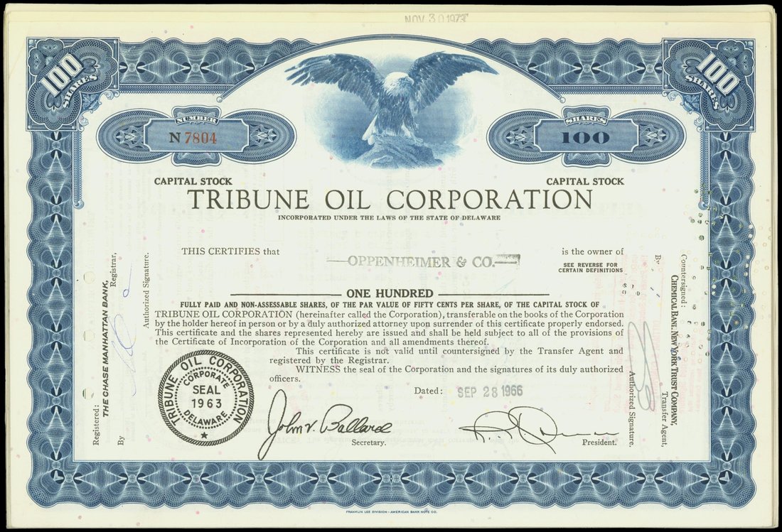 United States of American, large group of 30 assorted share certificates, mostly from the latter half of the 20th century, hole punch cancelled,