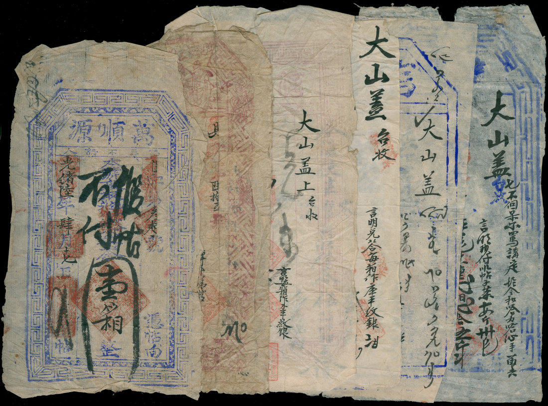 Late Qing/Early Republican era, a group of 6 promissory notes and related items, for various commodities, including tea bricks,