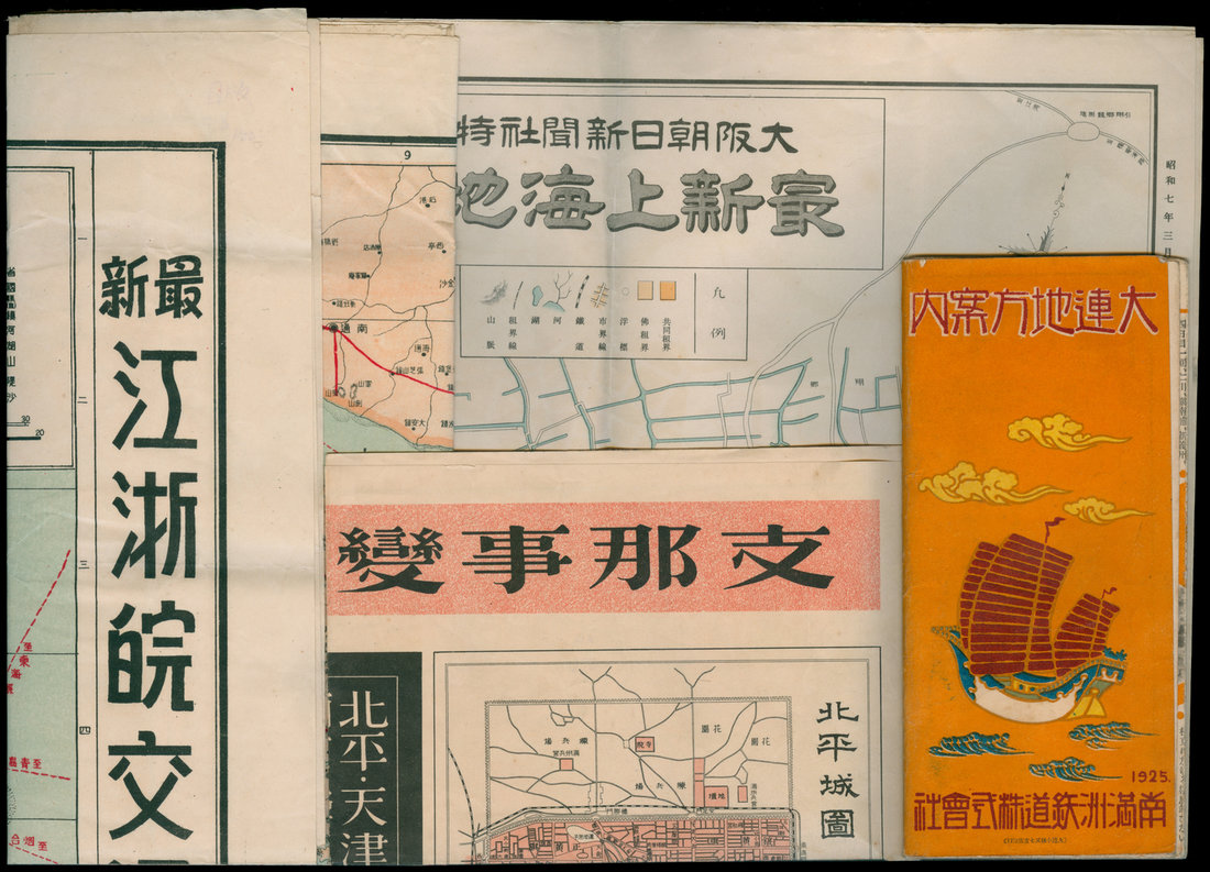 Maps of China before WWII, consisting of a tourist map of Dairen, 1925, map of Shanghai in 1932, map of main China cities in 1937, all printed by Japanese, together with a transportation map of Kiangsu, Chekiang and Anhwei Provinces, 1937, printed in Shanghai,