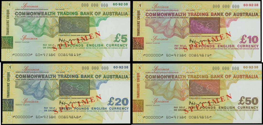 Commonewealth Trading Bank of Australia, specimen, traveller's cheques for 5, 10, 20 and 50 pounds, yellow on multicolour, geometric designs,