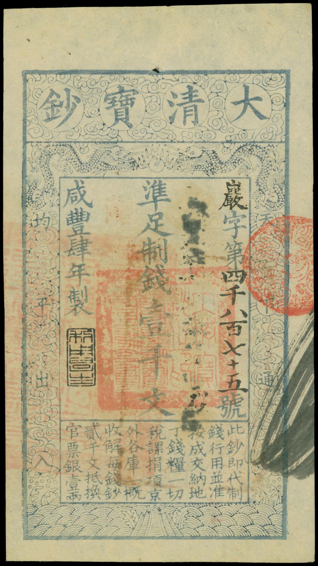 Qing Dynasty, Da Qing Bao Chao, 1000 cash, Year 4(1854), 'Yan' prefix 4875, vertical format, blue and white, dragons at top, large red seals, multiple red stamps and brush writing on reverse,