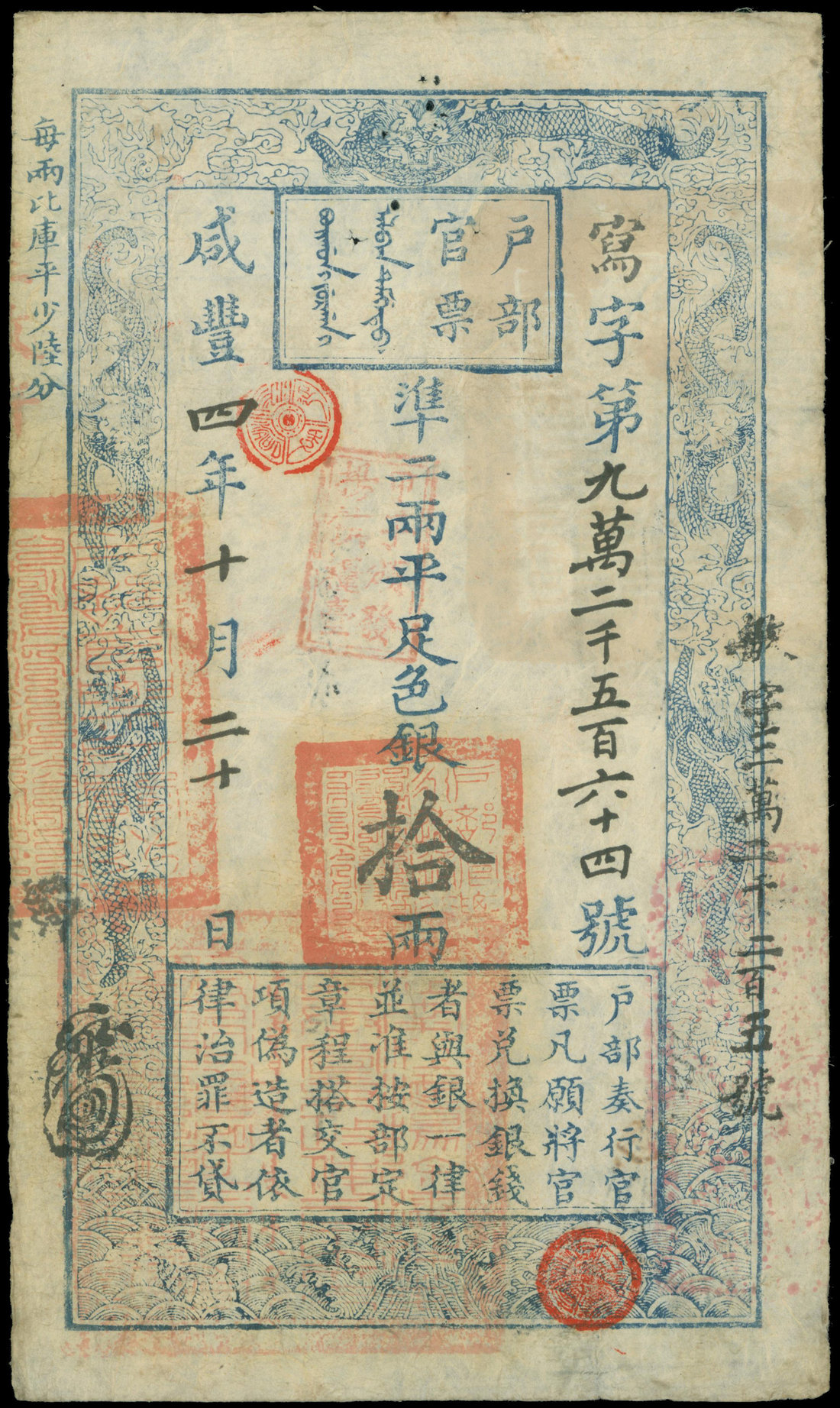 Qing Dynasty, Hu Bu Guan Piao, 10 taels, Year 4(1854), 'Xie' prefix 92564, vertical format, blue and white, dragons at top, large red seals, multiple red stamps and brush writing on reverse,