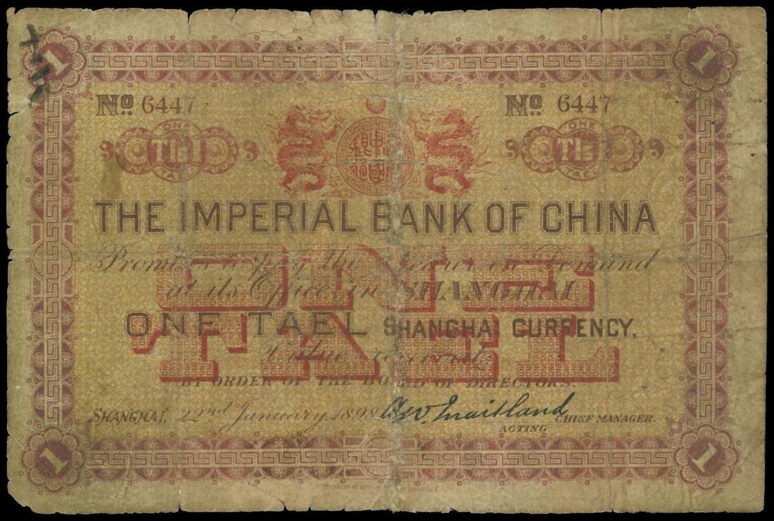 The Imperial Bank of China, 1 tael, 1898, serial number 6447, red, dark violet on yellow underprint, facing dragons and seal at top centre, reverse Chinese characters,