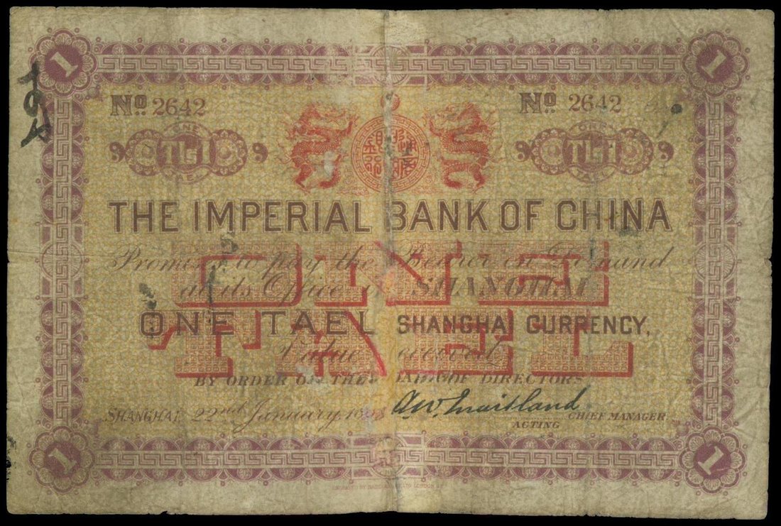 The Imperial Bank of China, 1 tael, 1898, serial number 2642, red, dark violet on yellow underprint, facing dragons and seal at top centre, reverse Chinese characters,