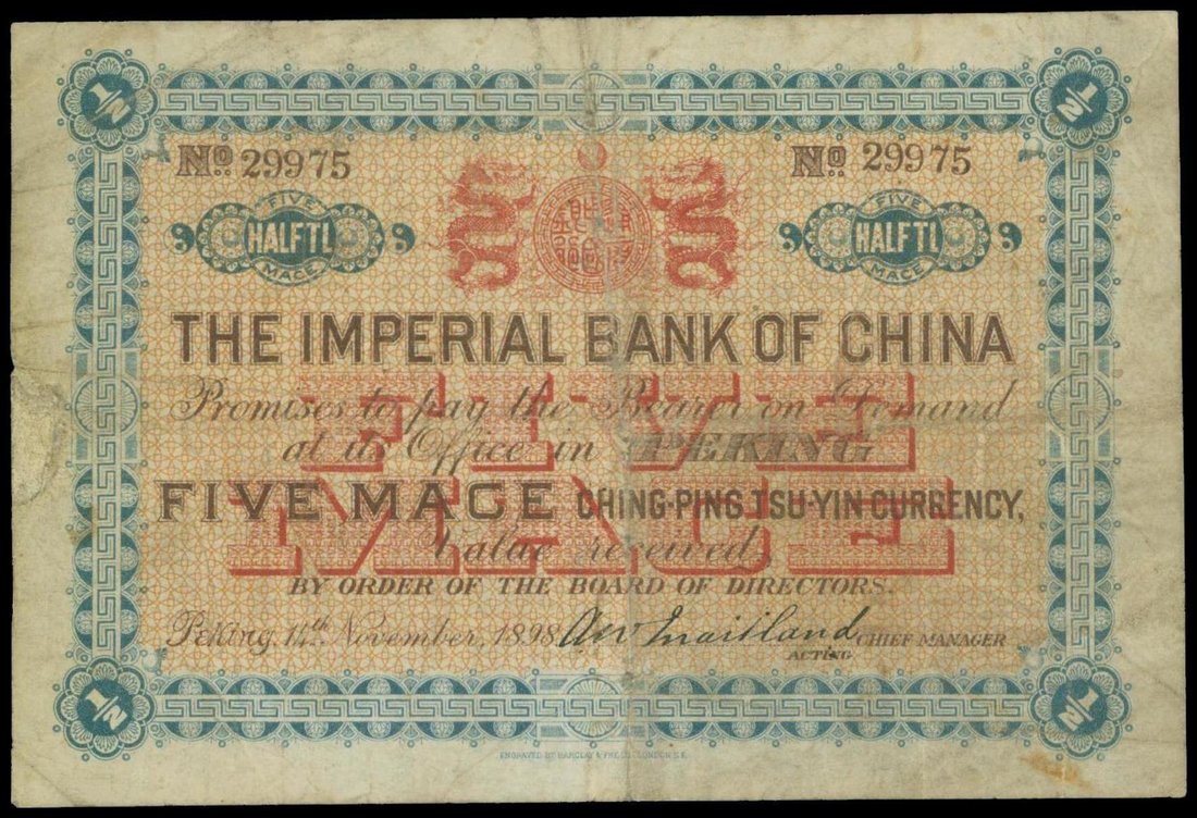 The Imperial Bank of China, 5 mace, 1898, serial number 29975, blue, dark brown and red, facing dragons and seal at top centre, reverse Chinese characters,