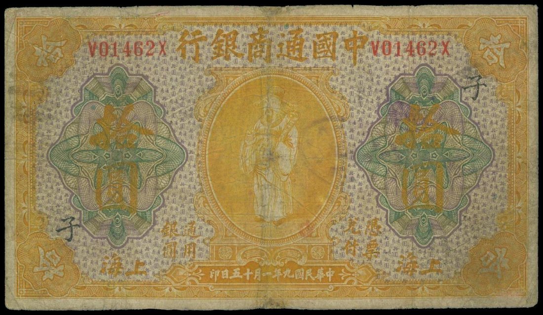 The Commercial Bank of China, $10, 1920, Shanghai, serial number V01462X, yellow on light green and multicolour underprint, god of wealth at centre, reverse yellow, lions holding medallion at centre, brush writings,
