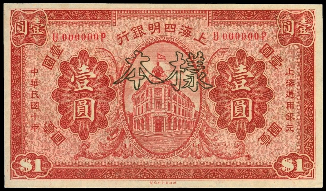 The Ningpo Commercial Bank, $1, 1921, Shanghai, specimen, brown, building at centre, reverse green,