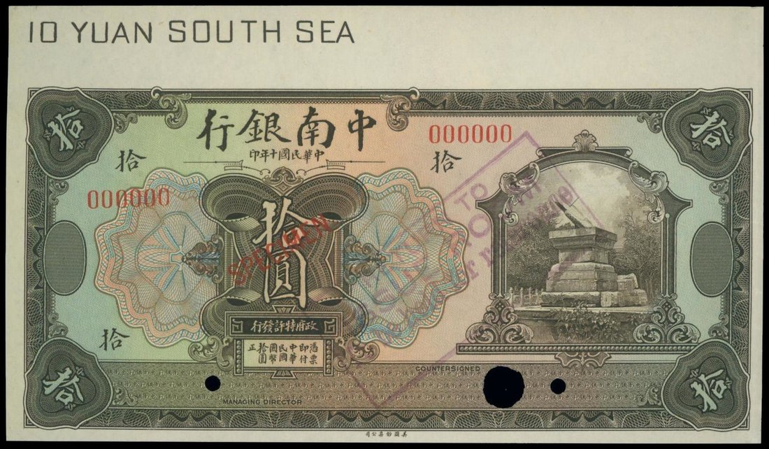 The China & South Sea Bank, 10 yuan, specimen, 1921, brown on multicolour underprint, sundial at right, with extra paper at top, reverse brown,
