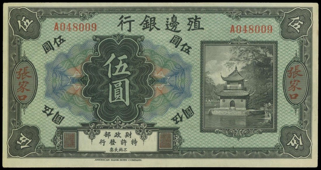Bank of Territorial Development, $5, ND(1916), Kalgan, serial number A048009, black on light green and multicolour underprint, building by lake at right, reverse green,