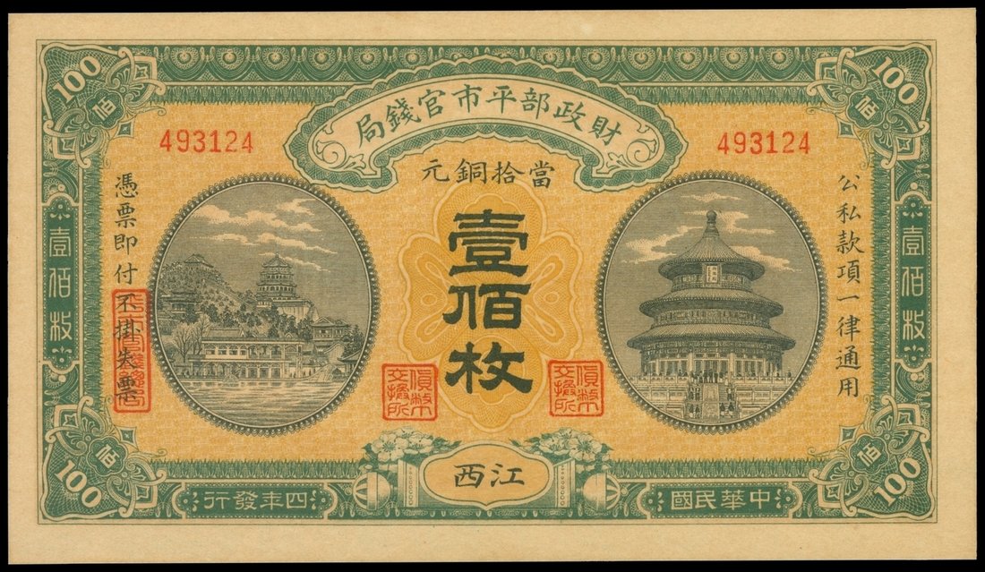 Market Stabilization Currency Bureau, 100 coppers, Kiangsi, 1915, serial number 493124, green on orange, Summer Palace at left, Temple of Heaven at right, reverse red-orange, pagoda on hillside,