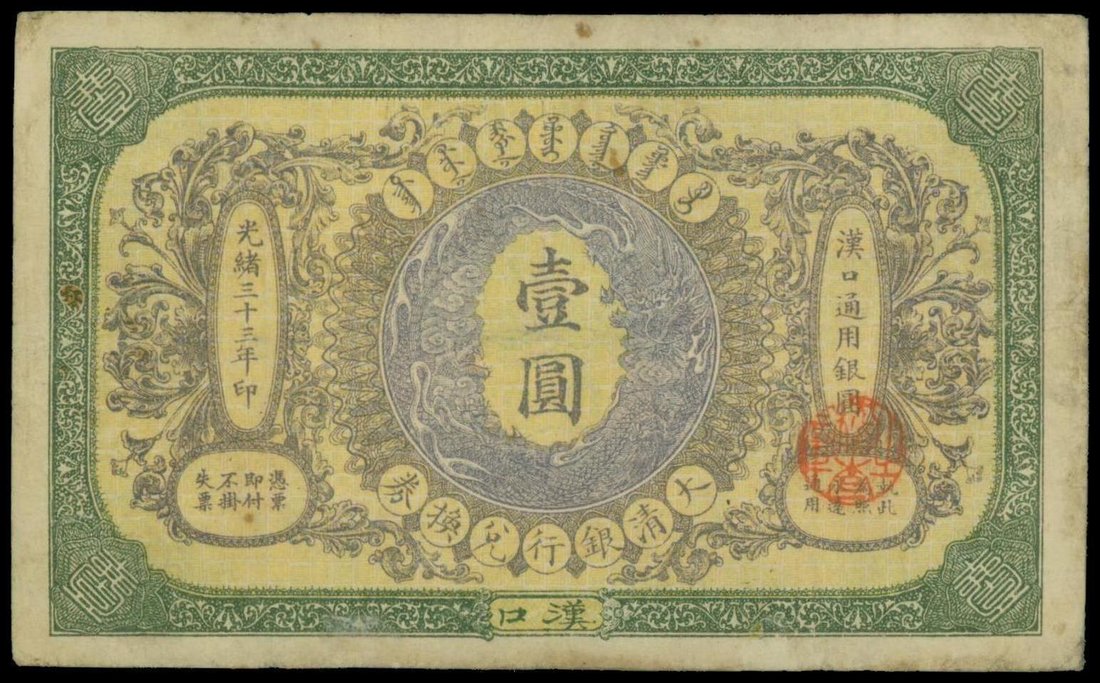 Ta Ching Government Bank, $1, 1907, Hankow, serial number H77666, green and light violet on yellow underprint, reverse blue on yellow orange,