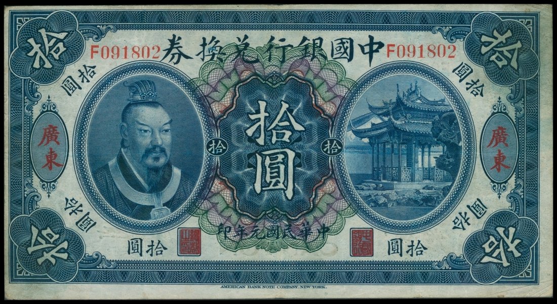 Bank of China, $10, 1912, Canton, serial number F091802, blue and multicolour guilloche, portrait of Huang Ti at left, pavilion at right, reverse blue, walled fortress at centre,