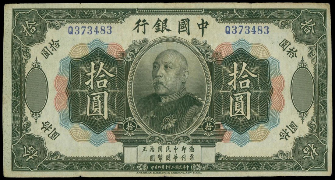 Bank of China, 10 yuan, 1914, serial number Q373483, black on multicolour underprint, Yuan Shih Kai at centre, reverse brown,