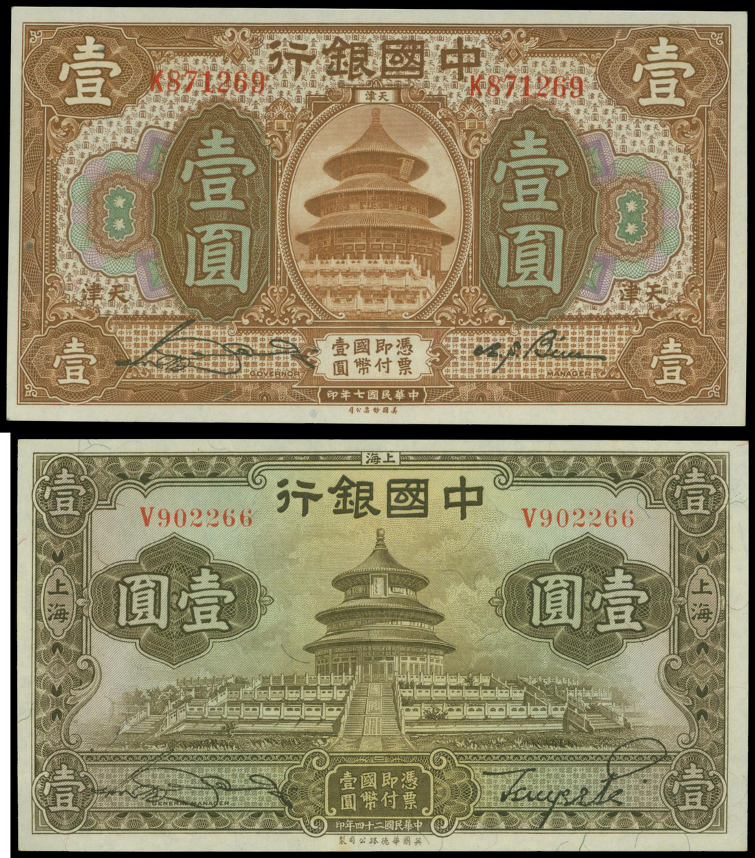 Bank of China, lot of 2 notes, 1 yuan, Tientsin, 1918, serial number K871269 and 1 yuan, Shanghai, 1935, serial number V902266,