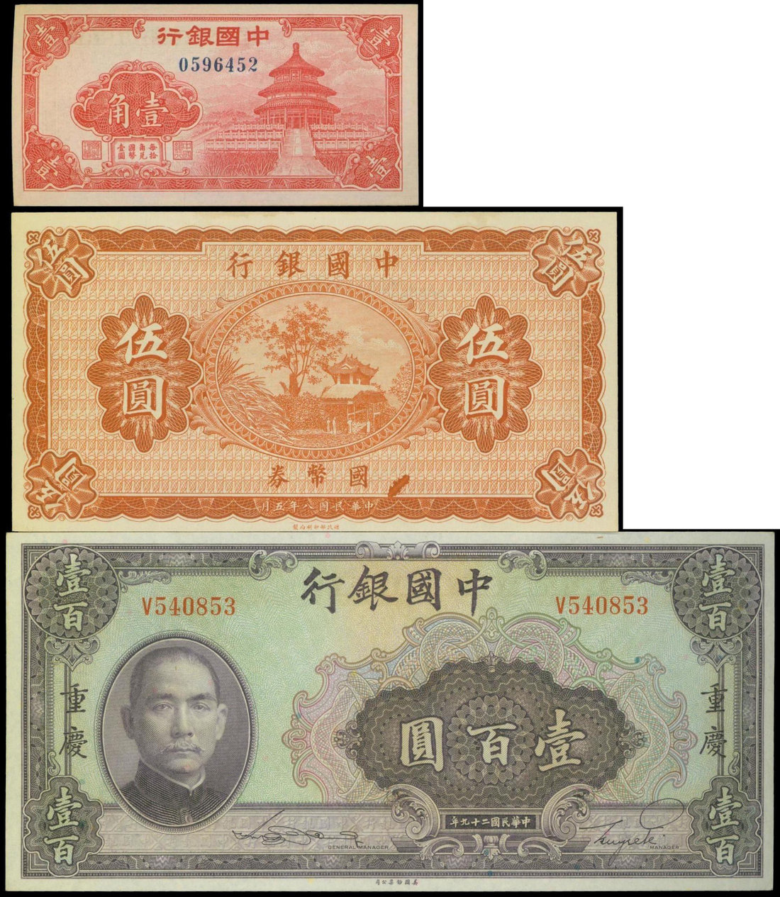 Bank of China, mixed lot of 10 cents, ND(1940), serial number 0596452, 5 yuan, 1919, remainder and 100 yuan, 1940, Chungking, serial number V540853, red, orange, violet on multicolour underprint respectively,