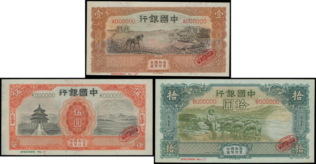 The Bank of China, a set of 3 specimens of 1, 5 and 10 yuan, Tientsin, 1931-1935, brown, orange and green respectively, red oval De La Rue stamp at bottom right corner,