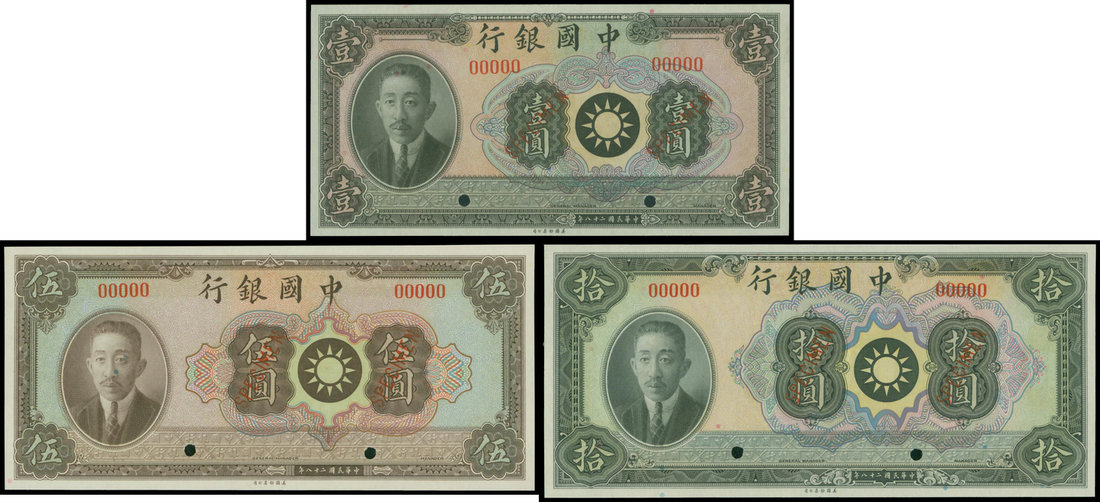 Bank of China, a set of 1, 5, 10 yuan, 1939, unissued specimen, multicoloured, portrait of Liao Chung-kai at left, reverse bank building at right,