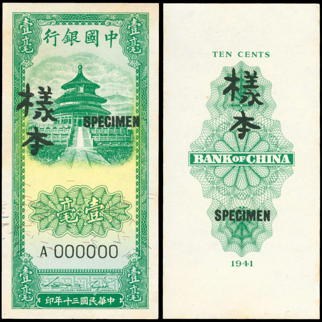 Bank of China, 10 cents, 1941, uniface obverse and reverse specimen, small vertical format, green and yellow, Temple of Heaven at top, reverse green,