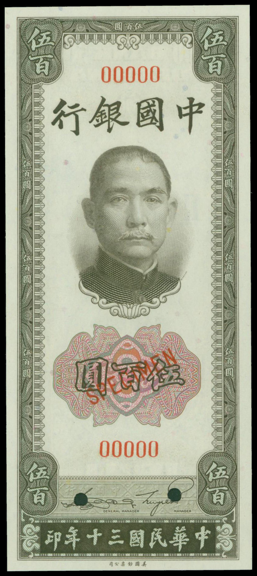 Bank of China, 500 yuan, 1941, specimen, red serial number 00000, vertical format, dark grey green and multicolour guilloche, Sun Yat Sen at top centre, reverse Temple of Heaven at centre below,
