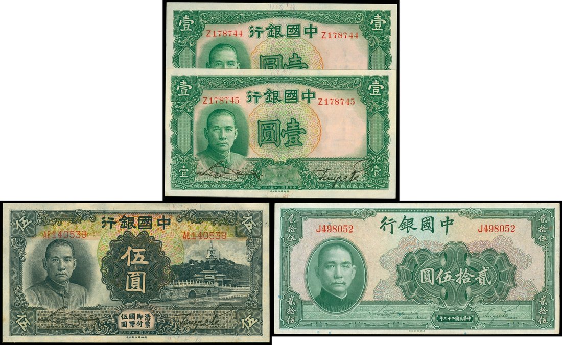 Bank of China, mixed lot of 1(2), 5, 25 yuan, 1935, 1936 and 1940, dark green, black, green on multicolour underprint, all with portrait of Sun Yat Sen at left,