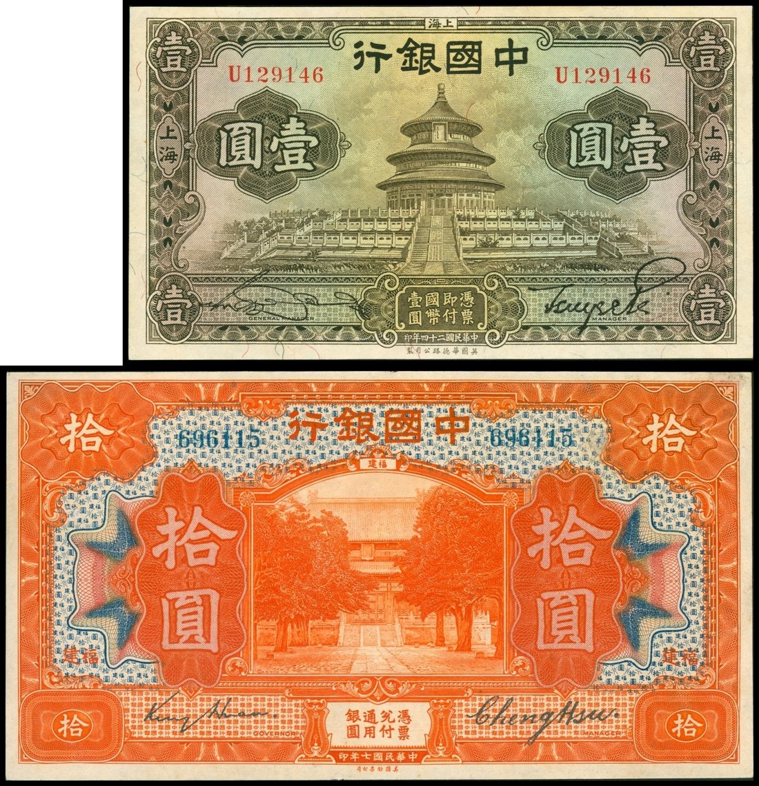 Bank of China, 1 yuan, 1935, Shanghai, serial number U129146, together with a 10 yuan, Fukien, 1918, serial number 696115, brown and orange on multicolour underprint respectively,