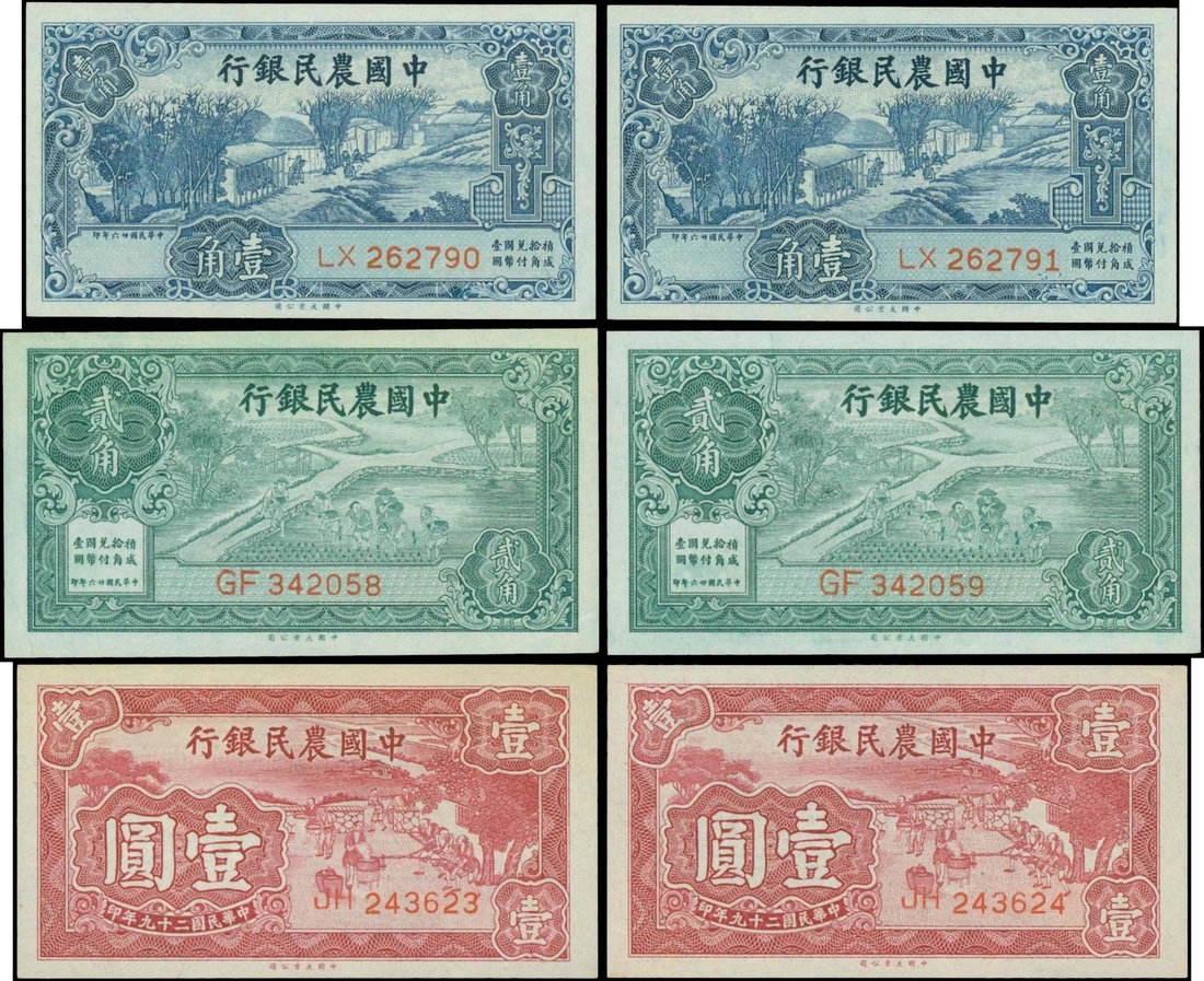 Farmers Bank of China, 2 sets of 10, 20 cents and 1 yuan, 1937-1940, blue, green and red respectively, various agricultural scenes,