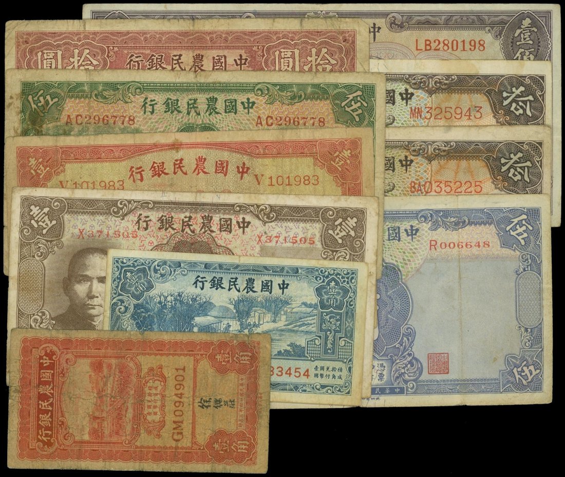 The Farmers Bank of China, a group of 10 notes, 10 cents to 100 yuan, mostly small denominations, 1935-1941, varying prefixes and serial number, fine to very fine.(10)