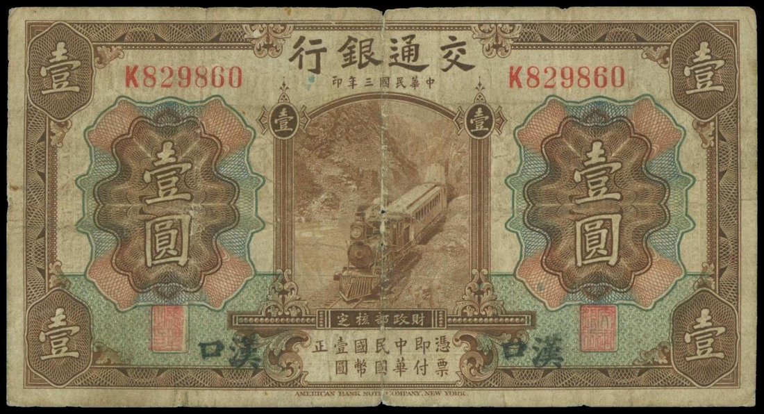 Bank of Communications, 1 yuan, 'Hankow', 1914, red serial K829860, brown on multicolour, steam passenger train at centre, red seal signatures, reverse brown, masted ship at centre,