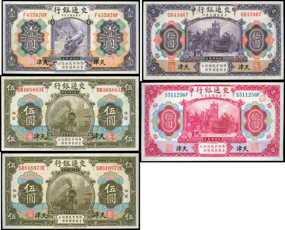 Bank of Communications, a group of 1, 5 (2), 10 yuan (2), all bearing the 'Tientsin' place of issue, 1914, (Pick 116r1, 117t, 118t1, 118(3)), good extremely fine (5)