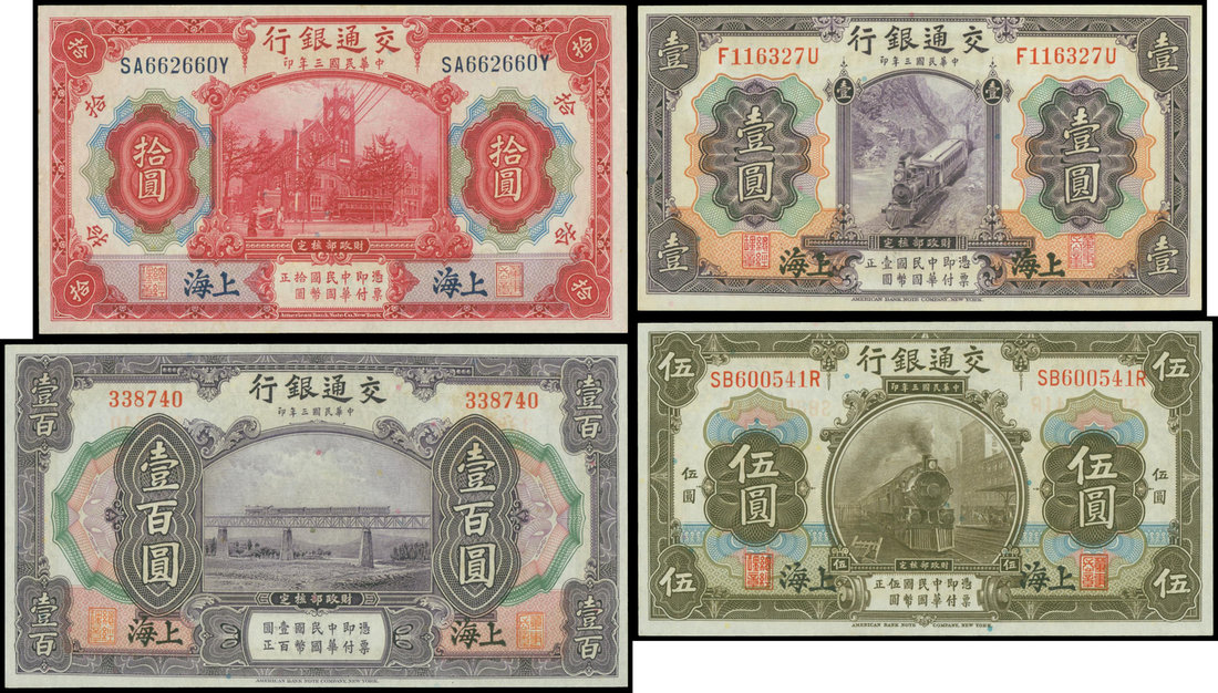 Bank of Communications, a group of 1, 5, 10 and 100 yuan, 'Shanghai' issue, 1914, purple, brown, red and purple respectively,