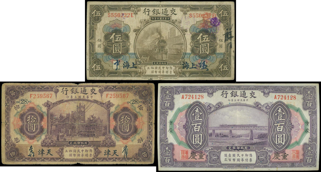 Bank of Communications, a group of 3 notes for 5, 10 and 100 yuan, issued for 'Shanghai', 'Tientsin' and 'Chungking' respectively,